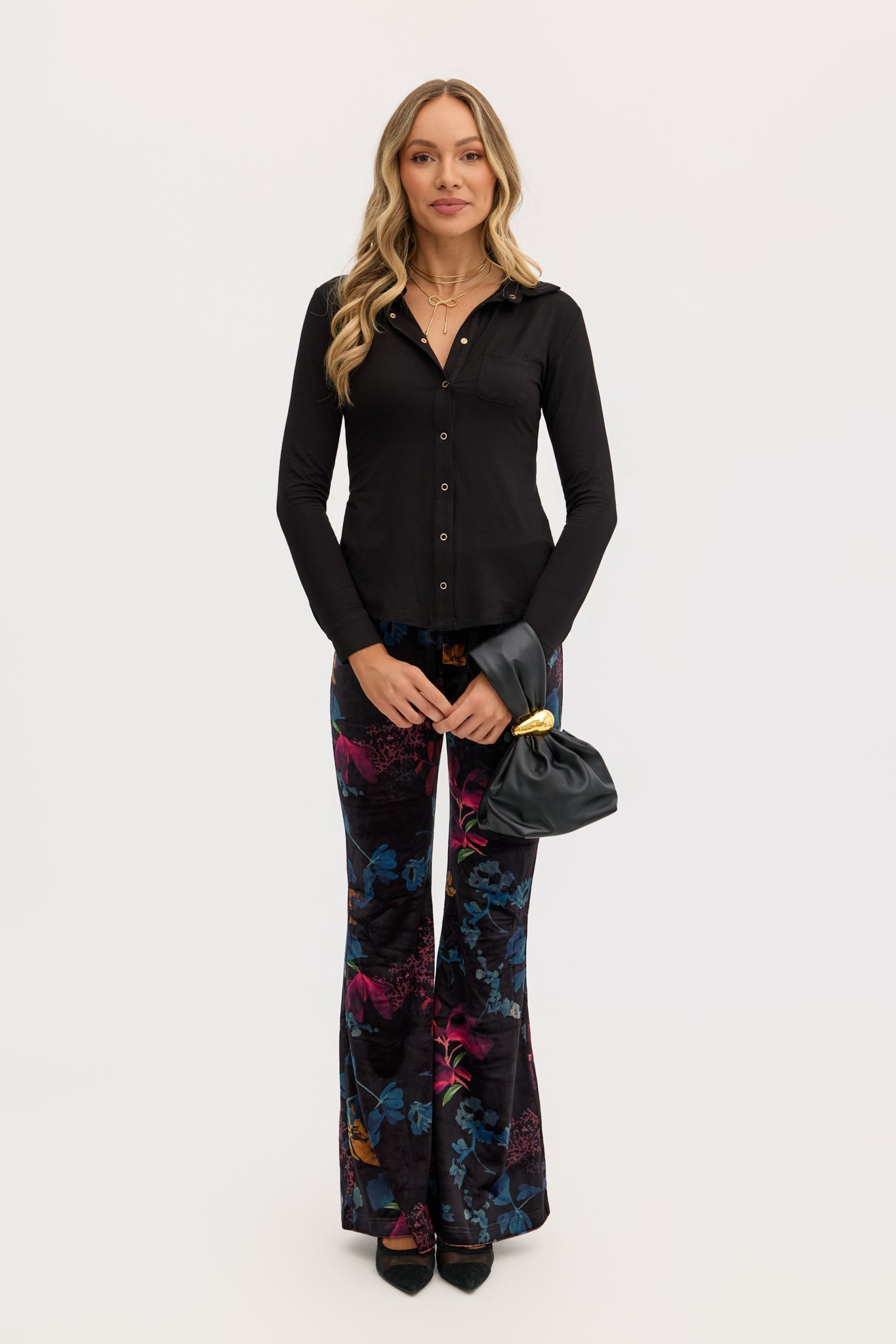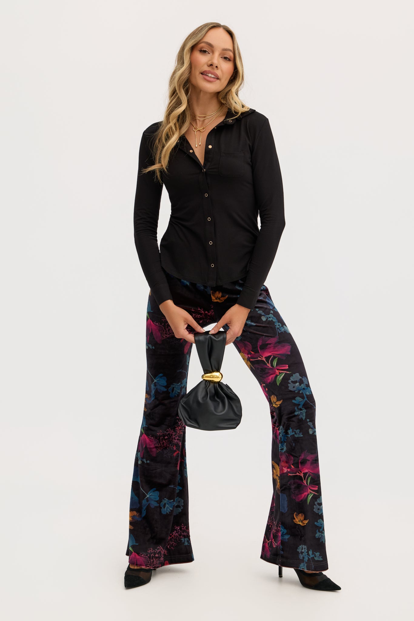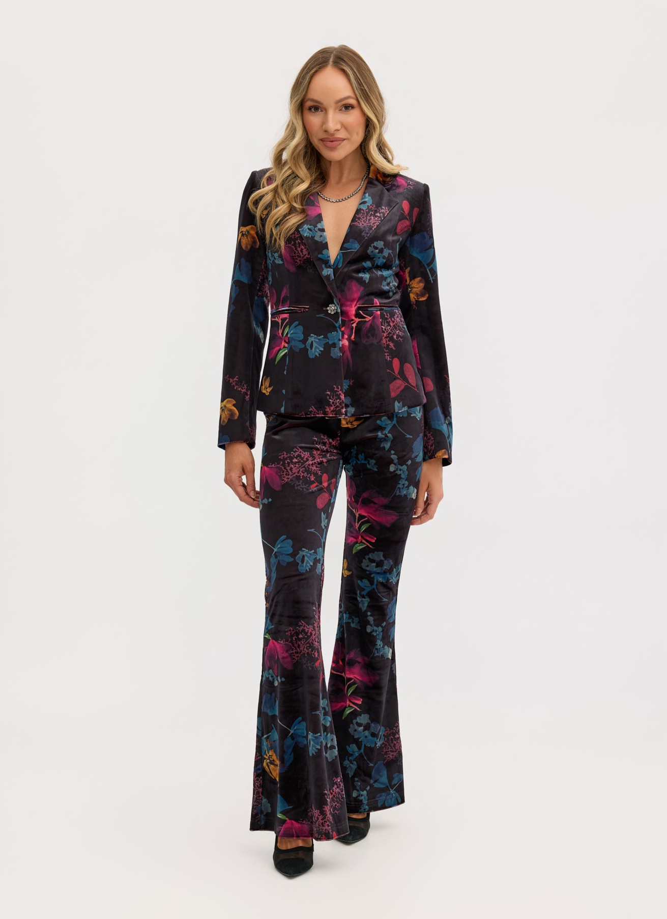 Introducing our exclusive “Florencia” flared pants. Made from comfortable stretch velvet, these funky pants feature a romantic floral print (designed in-house) and have a slimming high waist with elasticised waistband for additional comfort.